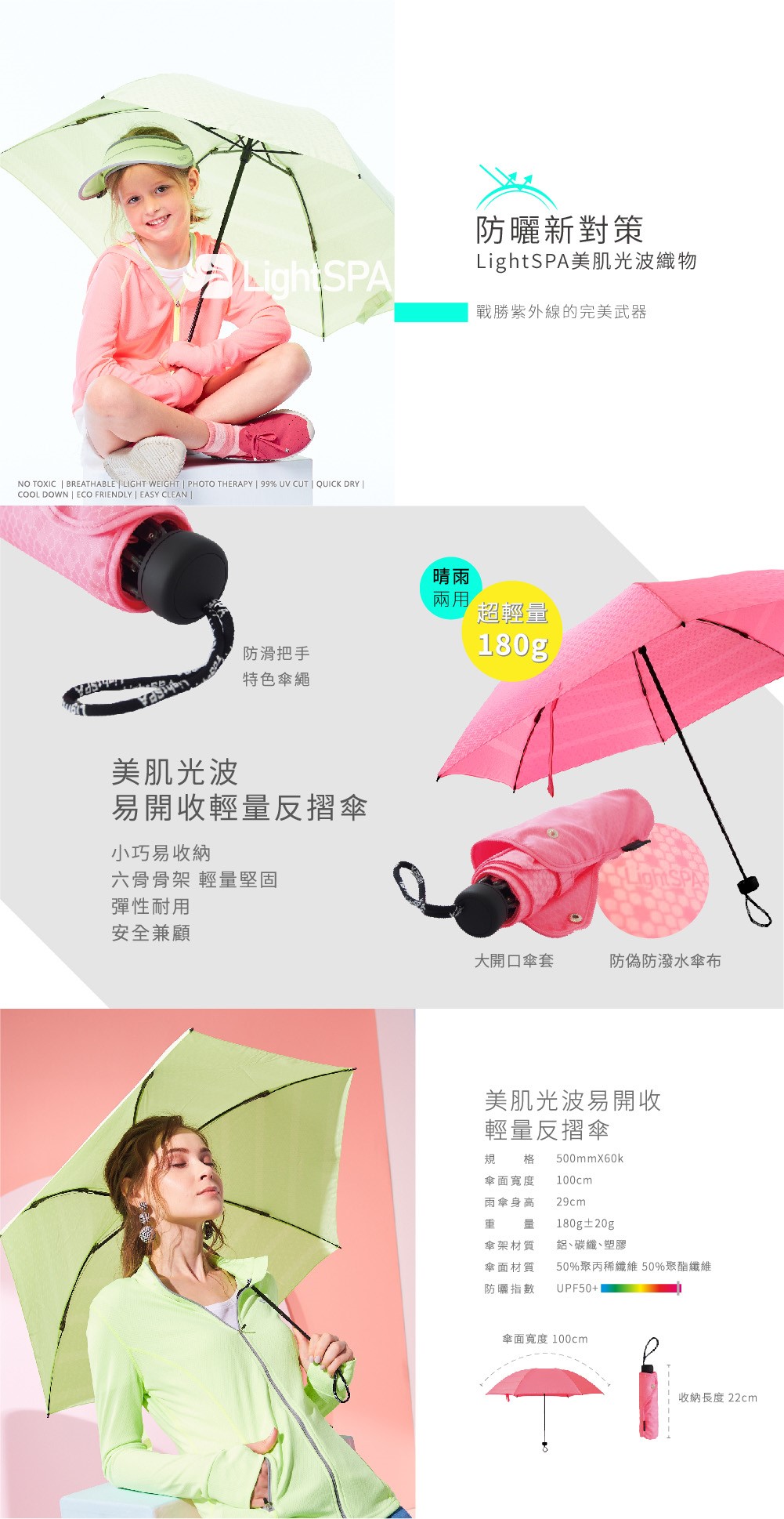 ● LightSPA聯合日本共同研發出第三代雙層蜂巢美肌光波面料,業界唯一晴雨兩用光療傘,擁有防曬、光療、防水、降溫4大功效。