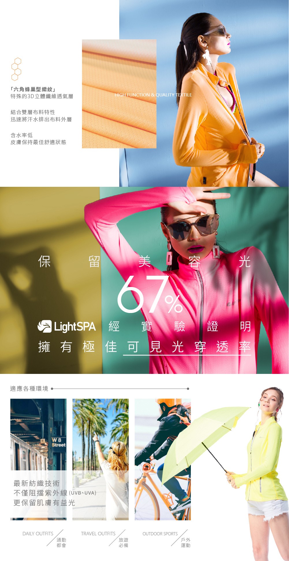 LightSPA美肌光波系列產品突破了傳統的紡織技術,材質輕透、在雙層的織物下過濾了99%的紫外線(UPF50 )。